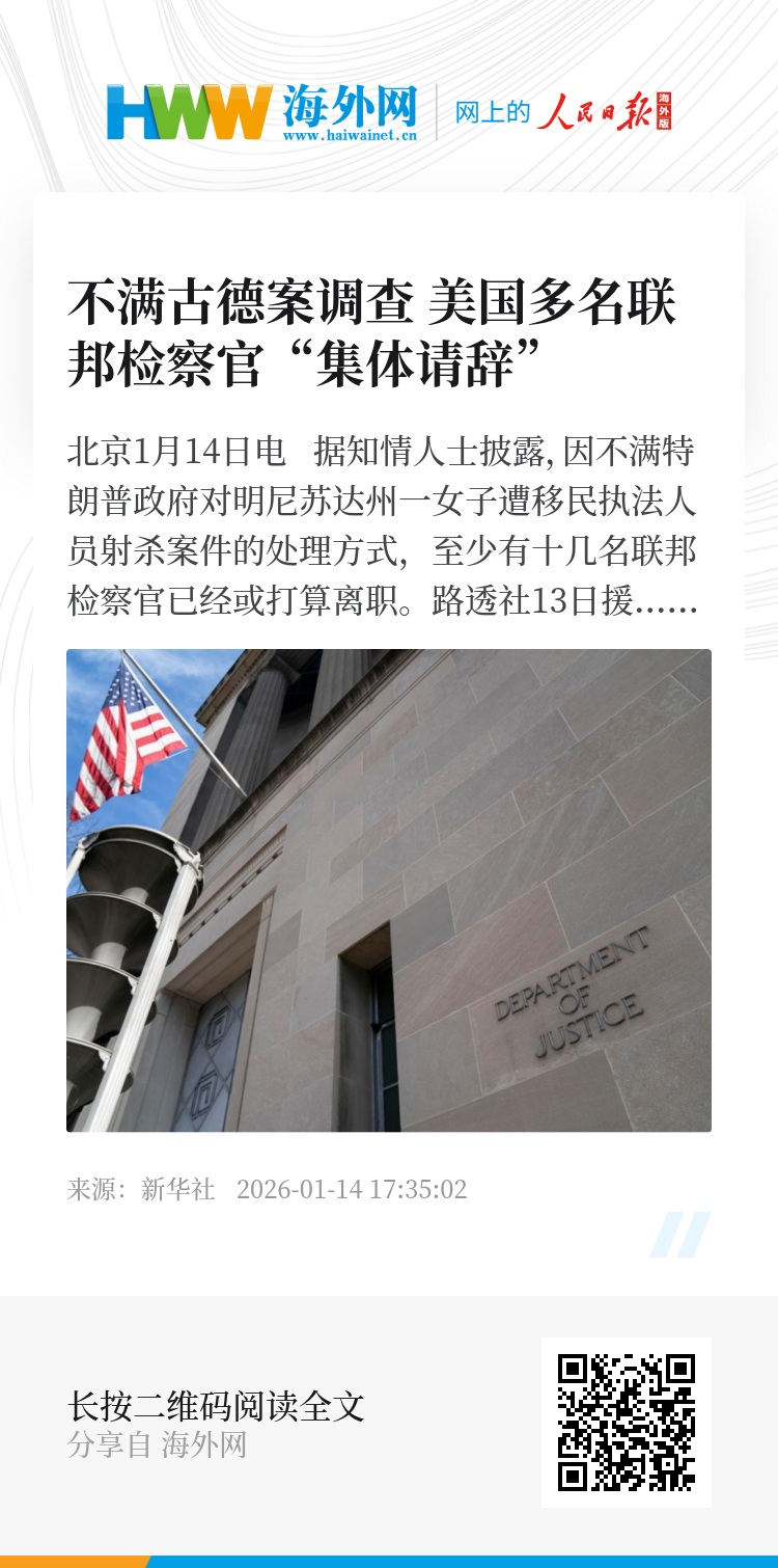 新华社北京1月14日电 据知情人士披露,因不满特朗普政府对明尼苏达州一女子遭移民执法人员射杀案件的处理方式,至少有十几名联邦检察官已经或打算离职。