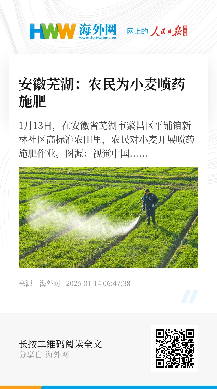 32923399,.安徽芜湖:农民为小麦喷药施肥,.2026-01-14 06:47:38,.204441,.张荣耀、李萌