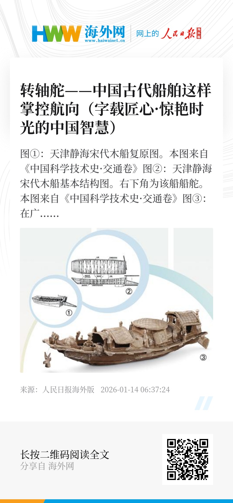 早在17、18世纪现代流体力学得到系统发展之前,唐代就已经使用转轴舵这种蕴含现代理论知识的船舶属具,彰显了中国先民的实用智慧。这种智慧在实践中萌发,又服务于实际应用,开启了后世种类丰富的船舵发展历程。蔡薇表示,后续考古发掘和研究文献所指的不平衡舵、平衡舵、升降舵、开孔舵等,本质都是转轴舵。它们均基于转轴舵运行原理发展、用以匹配不同船型和不同航运的需求。