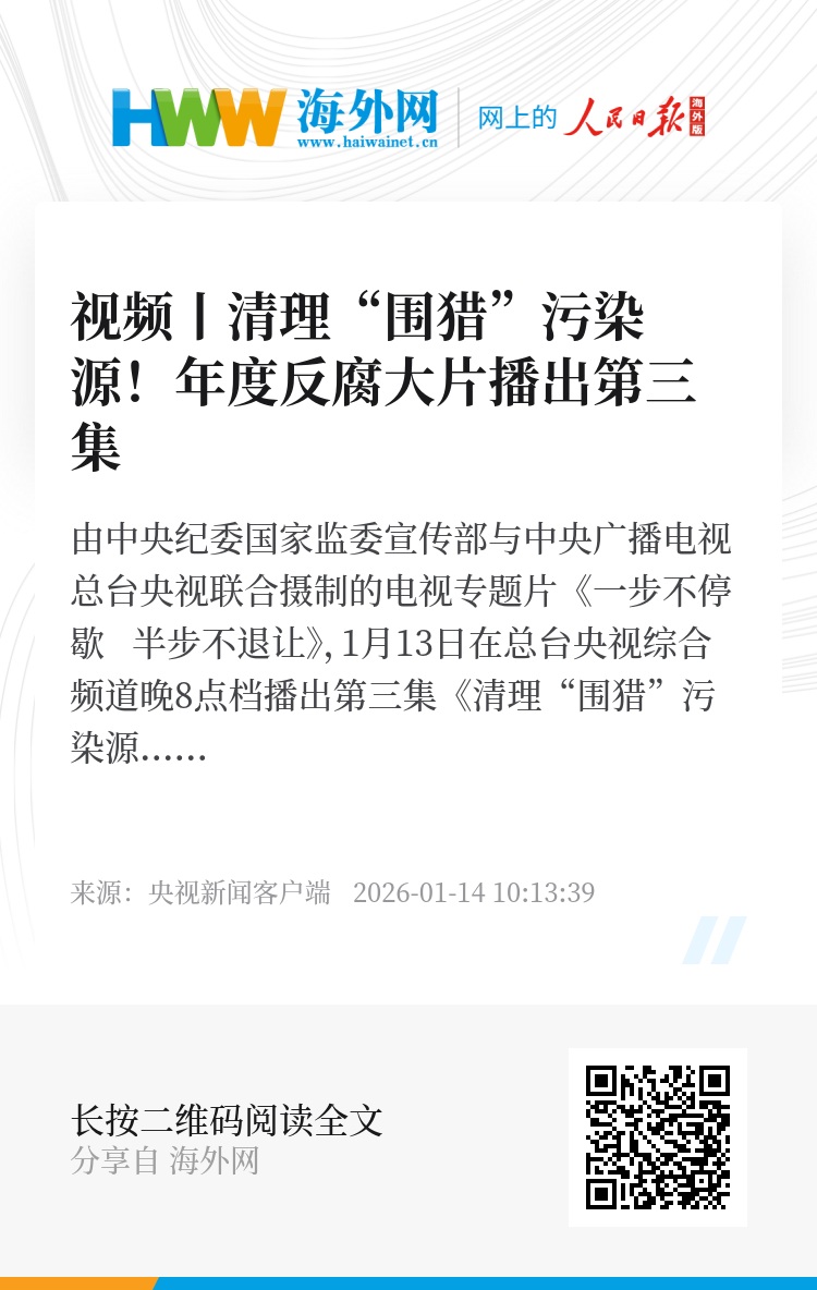 由中央纪委国家监委宣传部与中央广播电视总台央视联合摄制的电视专题片《一步不停歇 半步不退让》,1月13日在总台央视综合频道晚8点档播出第三集《清理“围猎”污染源》,央视新闻新媒体平台同步播发。