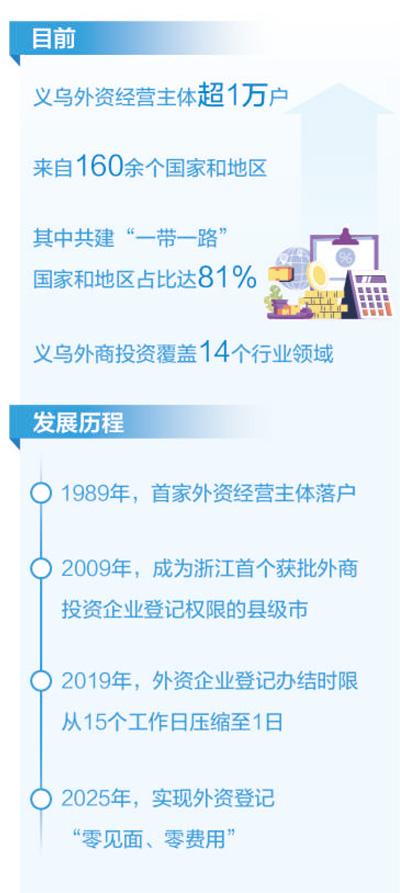 简化部分外国投资者外文材料,外国自然人凭外国人永久居留身份证即可办理登记;推动外资登记全程网办,外资企业登记办结时限从15个工作日压缩至1日……“从首家外资经营主体落户义乌至今,义乌科学把关外商投资准入,深耕商事制度改革试验田,积极做好外资经营主体培育工作,吸引外商来此投资兴业。”义乌市市场监管局行政审批科科长陈群阳说。