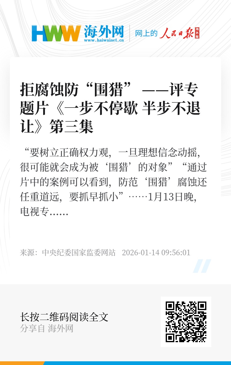 “要树立正确权力观,一旦理想信念动摇,很可能就会成为被‘围猎’的对象”“通过片中的案例可以看到,防范‘围猎’腐蚀还任重道远,要抓早抓小”……1月13日晚,电视专题片《一步不停歇 半步不退让》第三集——《清理“围猎”污染源》一经播出,就在广大党员干部群众中引发热烈反响。