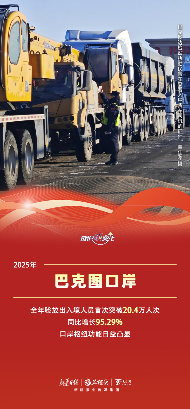 过去一年,新疆口岸经济活力十足,自信新疆也在开放中得到了最直接、最有力的印证。霍尔果斯、阿拉山口、吉木乃、塔克什肯……这些口岸如同镶嵌在祖国西北边陲的璀璨明珠,在共建“一带一路”宏伟蓝图中,焕发出前所未有的生机。2025年,新疆口岸实现了哪些新突破?取得了怎样的亮眼成绩?今天的《数说“新”变化》一起来看看。