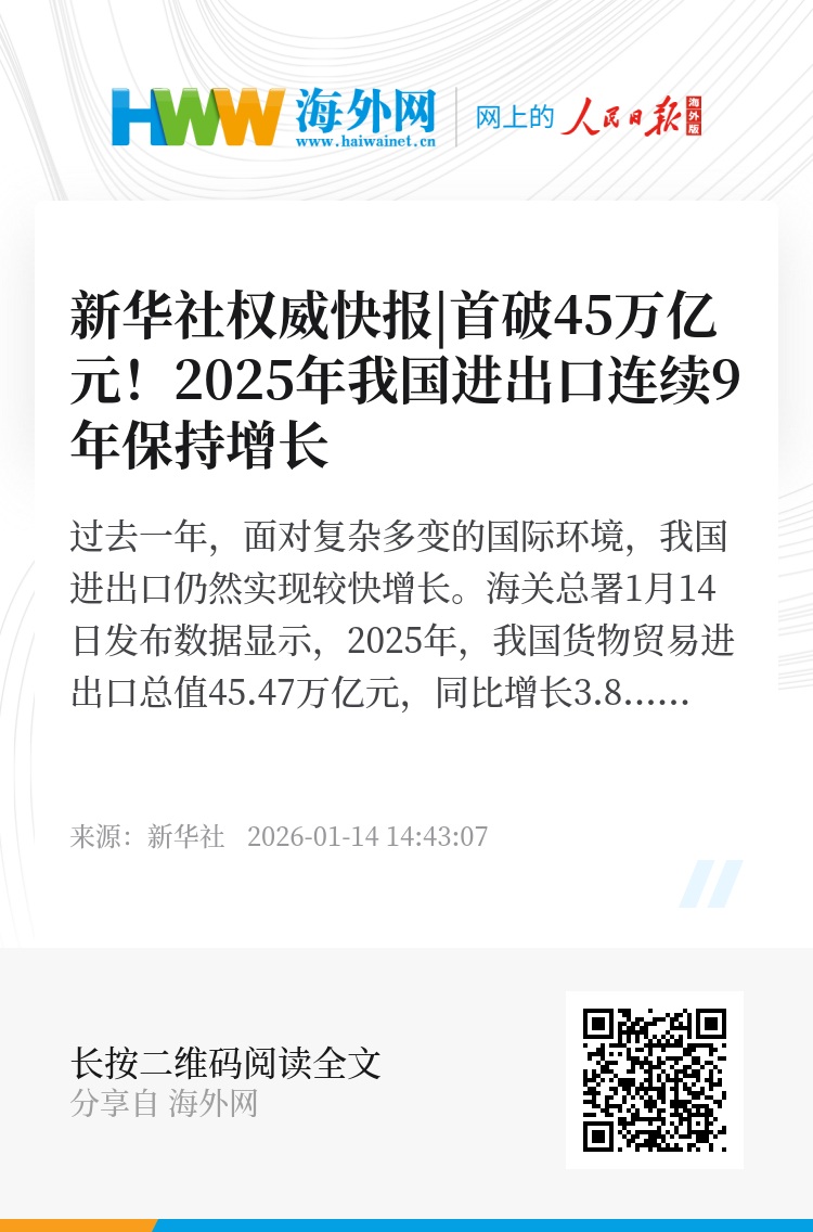 海关总署1月14日发布数据显示,2025年,我国货物贸易进出口总值45.47万亿元,同比增长3.8%,自2017年起连续9年保持增长。