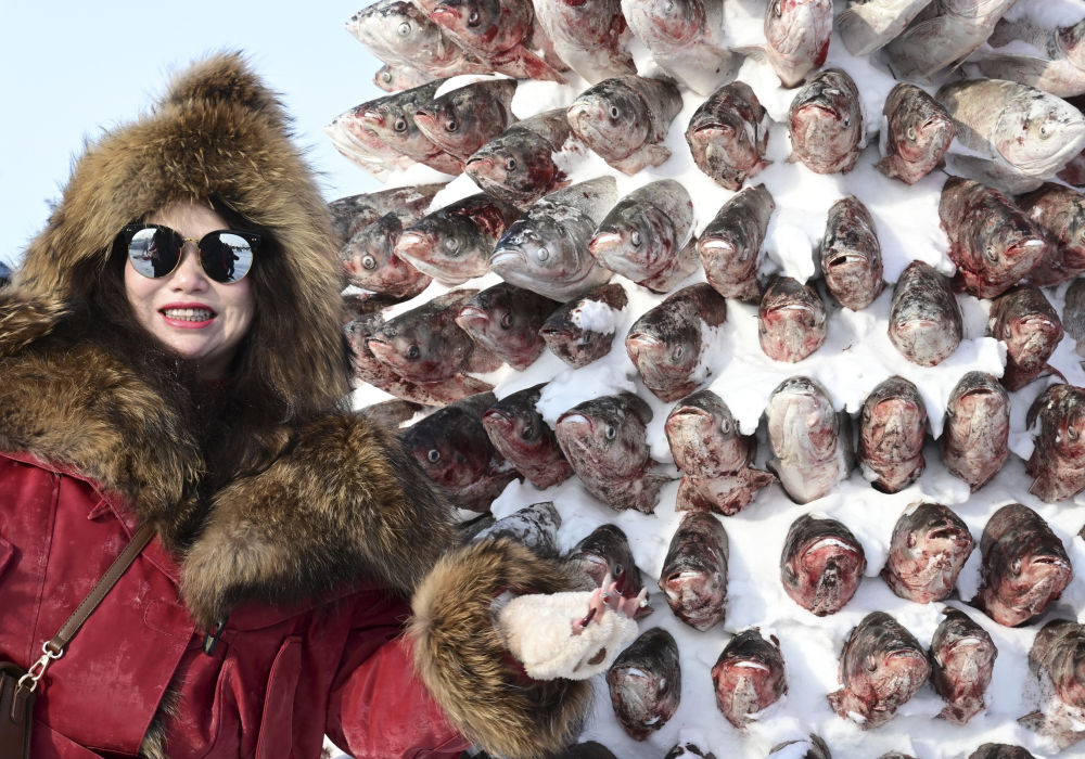 ↑1月10日,在黑龙江省肇东市大似海冬捕渔猎文化节上, 游客在“冻鱼塔”前留影。新华社发(杨威摄)