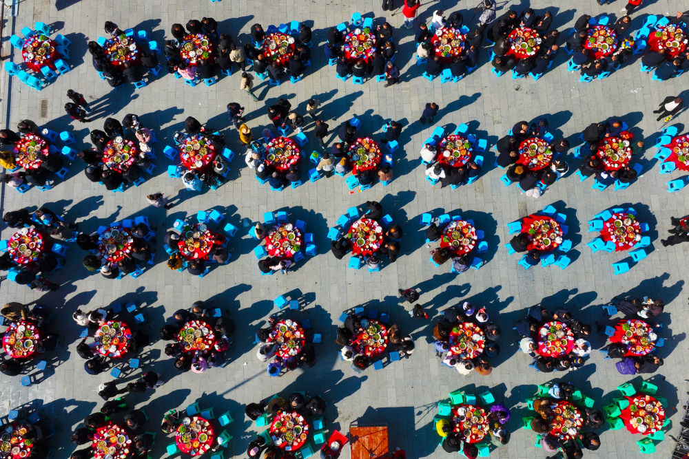 ↑1月11日,游客在重庆市黔江区第二届武陵黑猪乡村文化节上享受武陵黑猪刨汤宴(无人机照片)。新华社发(杨敏摄)