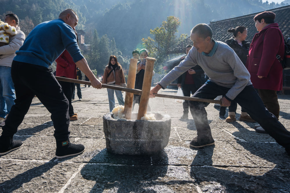 ↑1月10日,在湖北省宣恩县沙道沟镇两河口村彭家寨,村民为游客打糍粑。新华社发(文林摄)
