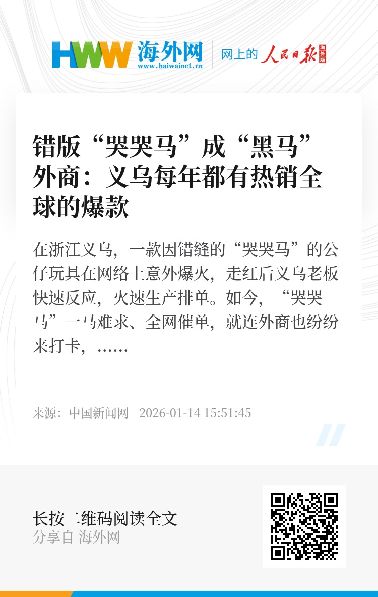 在浙江义乌,一款因错缝的“哭哭马”的公仔玩具在网络上意外爆火,走红后义乌老板快速反应,火速生产排单。如今,“哭哭马”一马难求、全网催单,就连外商也纷纷来打卡,他说“每年义乌都会有商品热销全世界”。从“残次品”到“隐藏款”,从失误变商机,“哭哭马”背后的义乌速度值得点赞!