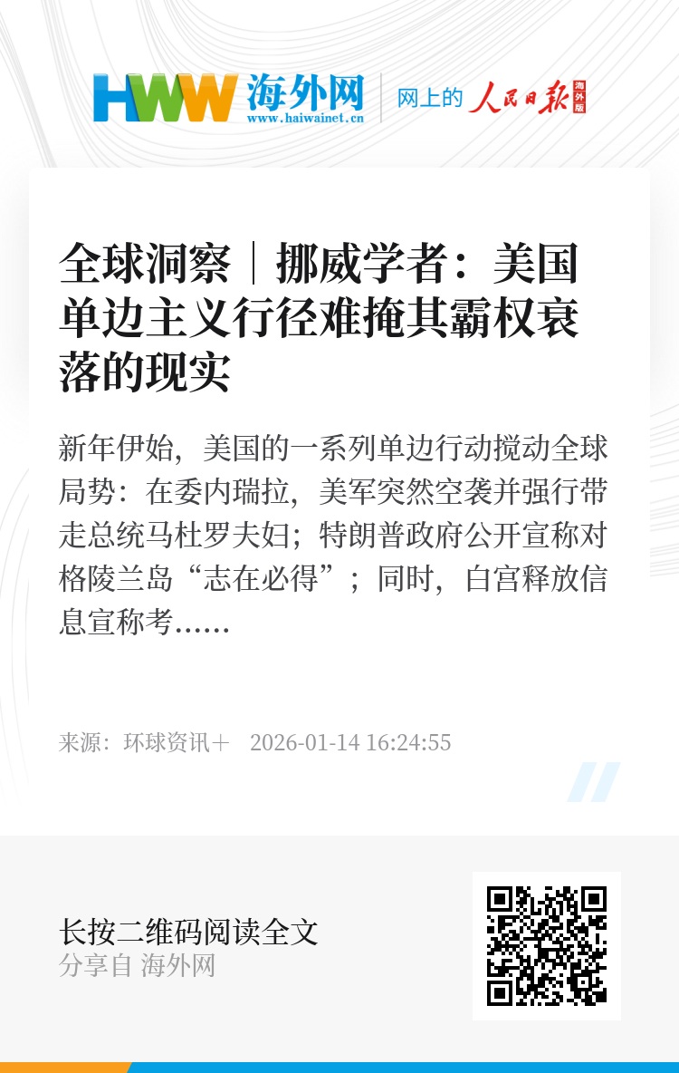 挪威东南大学(University of South-Eastern Norway)教授格伦·迪森(Glenn Diesen)日前在接受总台环球资讯《全球洞察》记者专访时表示,美国近期针对委内瑞拉、格陵兰岛等地的行动和威胁,核心意图是通过军事干预和资源控制来巩固霸权地位。