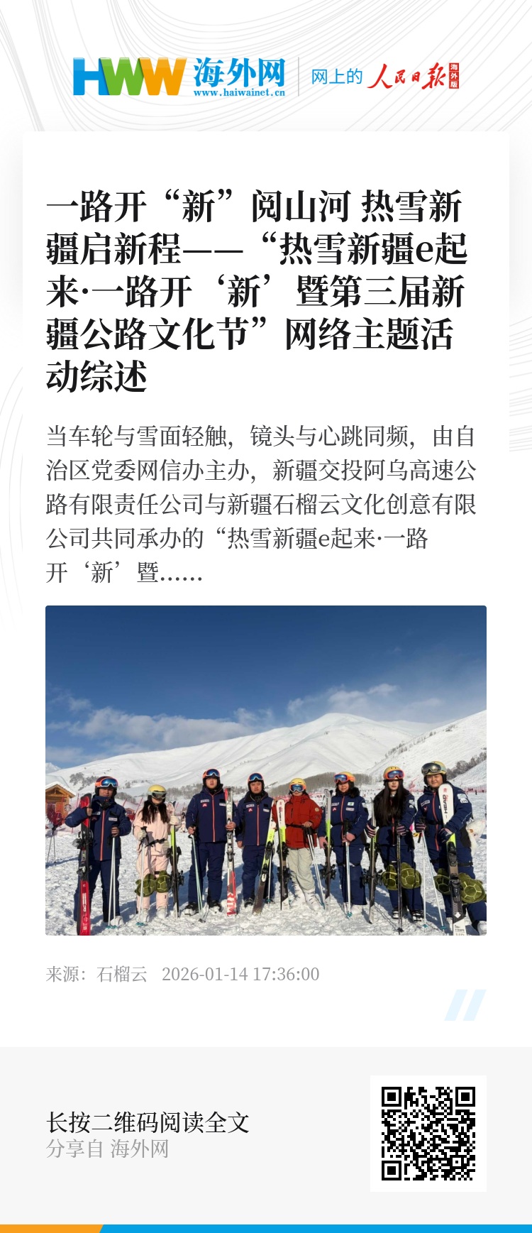 当车轮与雪面轻触,镜头与心跳同频,由自治区党委网信办主办,新疆交投阿乌高速公路有限责任公司与新疆石榴云文化创意有限公司共同承办的“热雪新疆e起来·一路开‘新’暨第三届新疆公路文化节”网络主题活动,于2025年12月25日正式启动。活动分为线下行走和线上传播两个阶段,在为期5天的行程中,活动邀约全国各地的网络名人代表,沿着四通八达的交通路网,见证新疆发展新变化;于银装素裹的冰雪胜境中,体悟多元交融的时代气象。