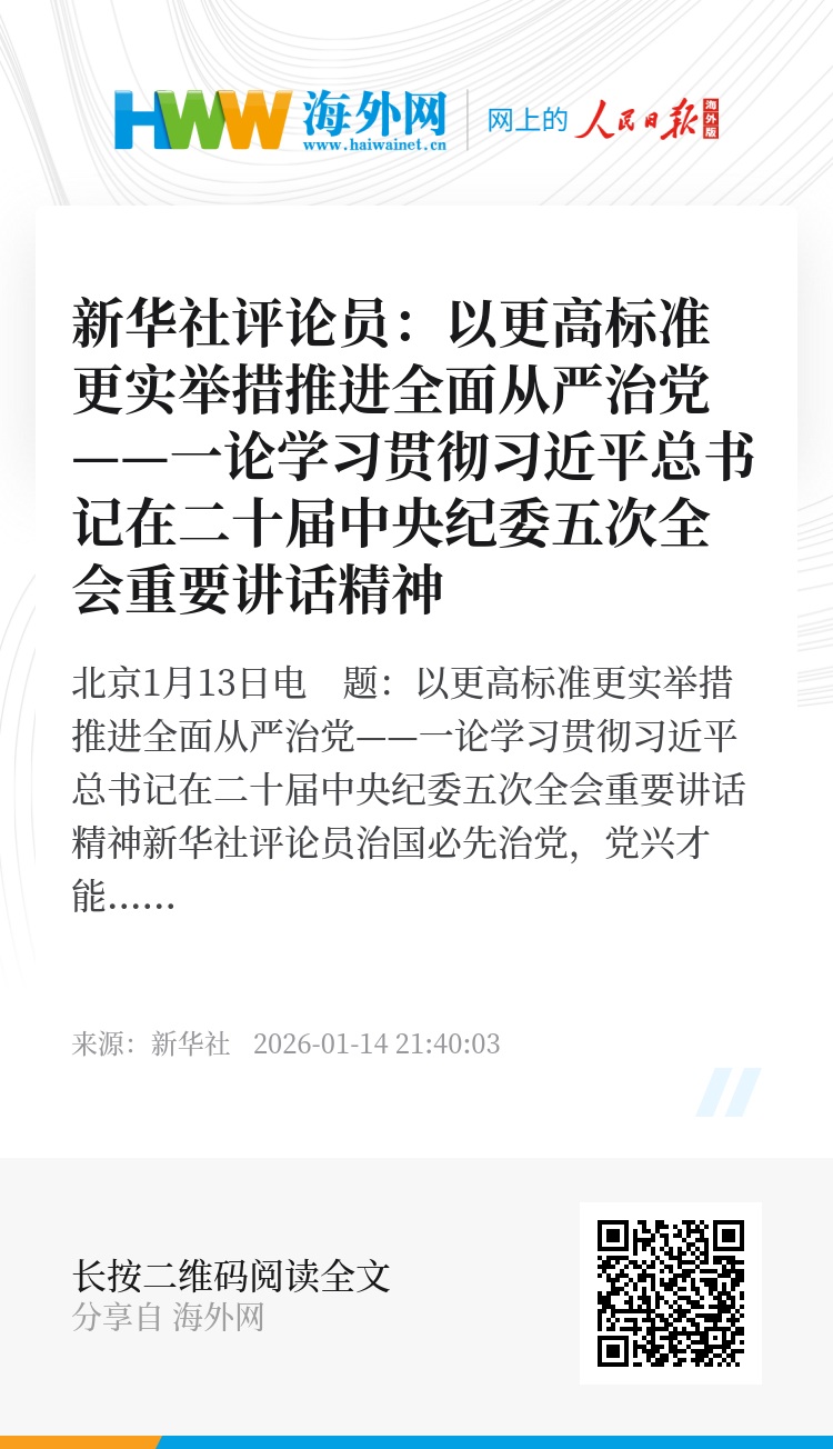 新华社北京1月13日电 题:以更高标准更实举措推进全面从严治党——一论学习贯彻习近平总书记在二十届中央纪委五次全会重要讲话精神
