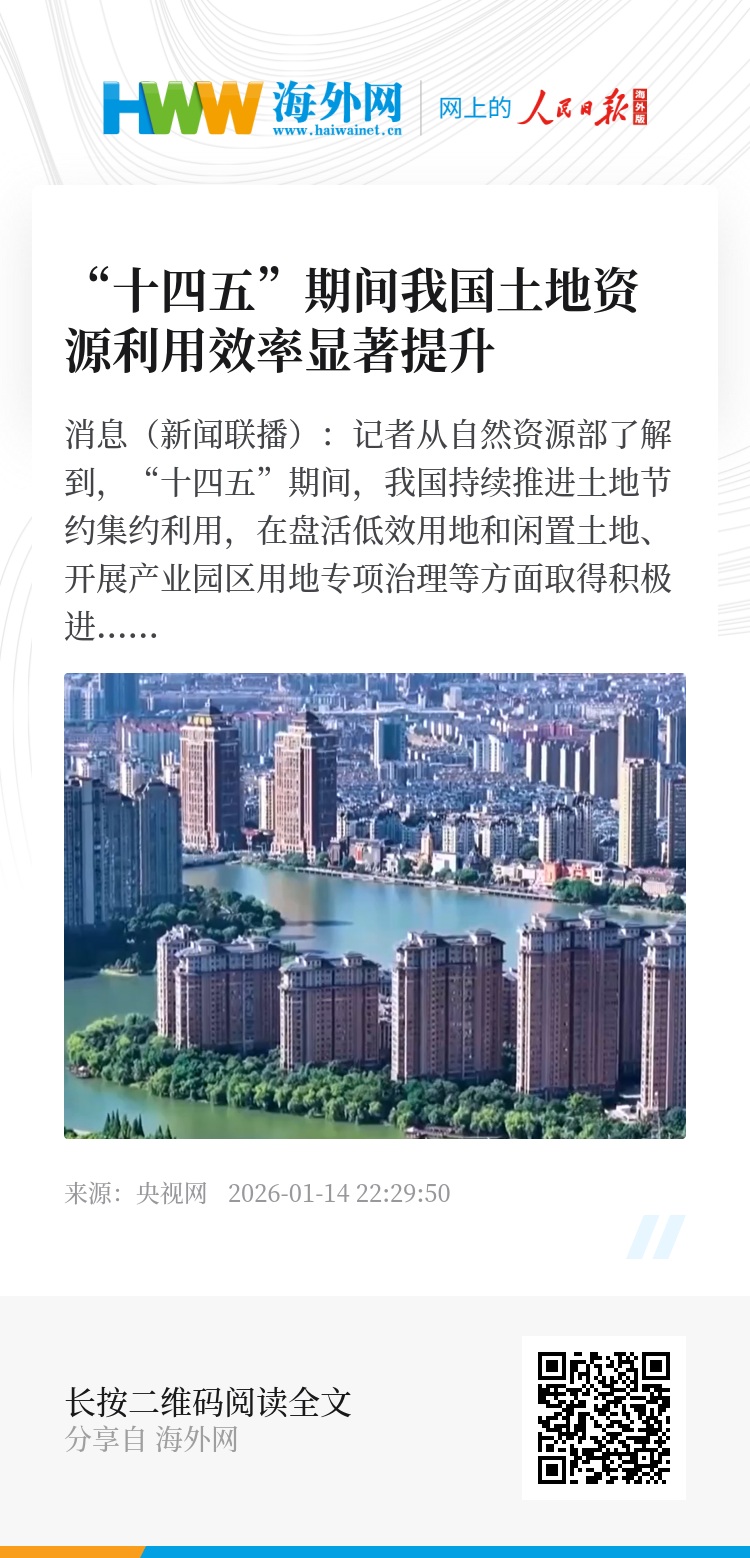 央视网消息(新闻联播):记者从自然资源部了解到,“十四五”期间,我国持续推进土地节约集约利用,在盘活低效用地和闲置土地、开展产业园区用地专项治理等方面取得积极进展,土地资源利用效率显著提升。