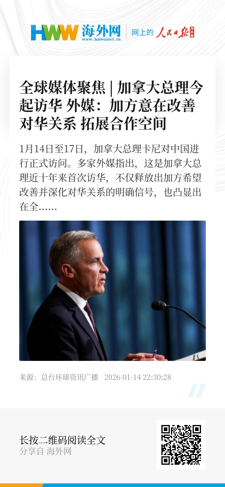 1月14日至17日,加拿大总理卡尼对中国进行正式访问。多家外媒指出,这是加拿大总理近十年来首次访华,不仅释放出加方希望改善并深化对华关系的明确信号,也凸显出在全球不确定性加剧的背景下,中国正成为越来越多国家的合作伙伴。