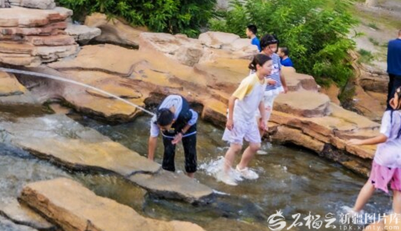 克拉玛依市金龙湖景区,游客在溪边嬉水玩耍(2025年7月10日摄)。田国建摄