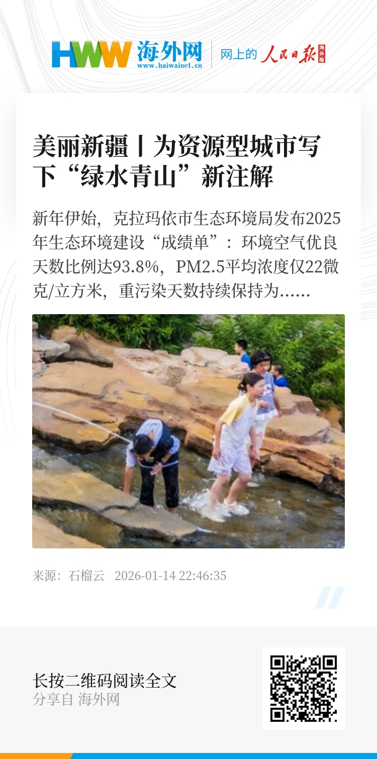 新年伊始,克拉玛依市生态环境局发布2025年生态环境建设“成绩单”:环境空气优良天数比例达93.8%,PM2.5平均浓度仅22微克/立方米,重污染天数持续保持为0;重点监测河流水质、集中式饮用水源水质达标率均实现100%,土壤环境安全稳定。