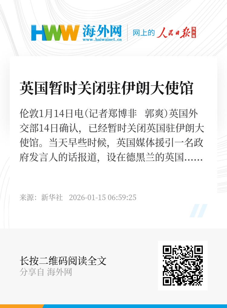 新华社伦敦1月14日电(记者郑博非 郭爽)英国外交部14日确认,已经暂时关闭英国驻伊朗大使馆。