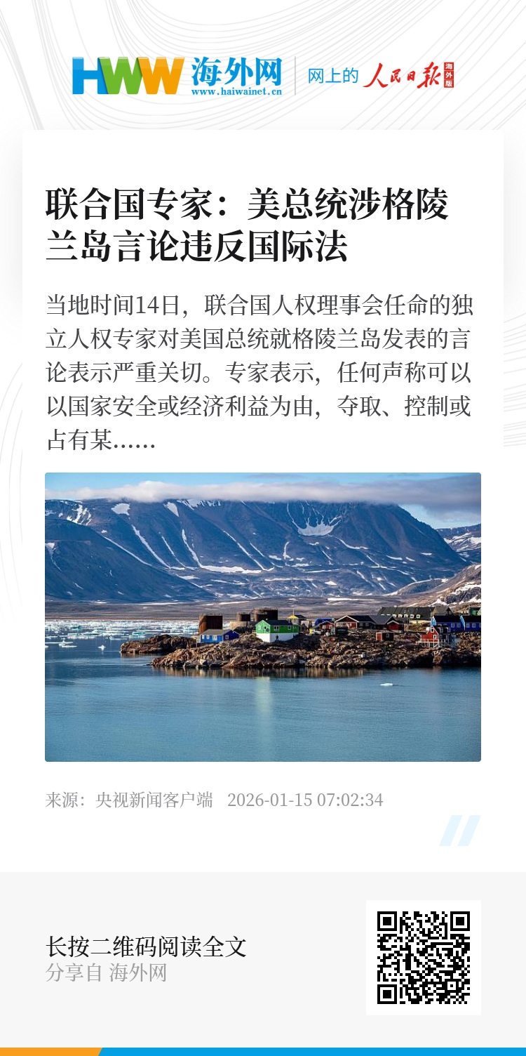 当地时间14日,联合国人权理事会任命的独立人权专家对美国总统就格陵兰岛发表的言论表示严重关切。专家表示,任何声称可以以国家安全或经济利益为由,夺取、控制或占有某一领土的说法,都体现了一种国际社会长期以来所摒弃的殖民统治逻辑。