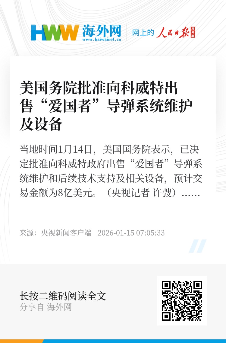 当地时间1月14日,美国国务院表示,已决定批准向科威特政府出售“爱国者”导弹系统维护和后续技术支持及相关设备,预计交易金额为8亿美元。(央视记者 许弢)