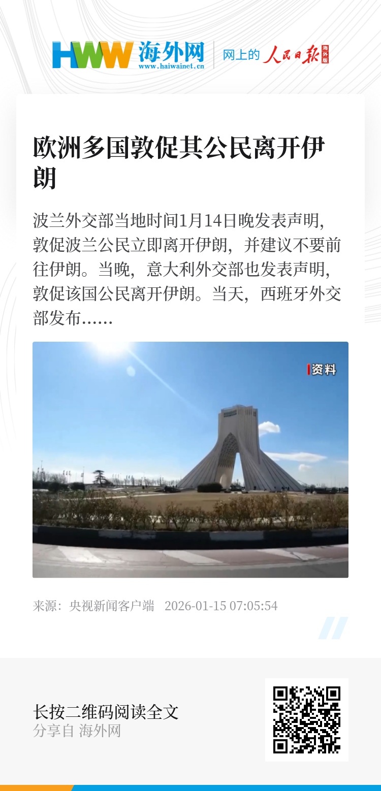 波兰外交部当地时间1月14日晚发表声明,敦促波兰公民立即离开伊朗,并建议不要前往伊朗。