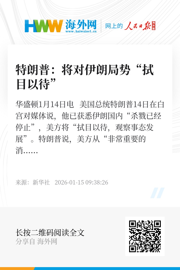 新华社华盛顿1月14日电 美国总统特朗普14日在白宫对媒体说,他已获悉伊朗国内“杀戮已经停止”,美方将“拭目以待,观察事态发展”。