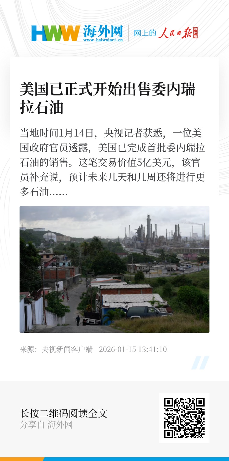 当地时间1月14日,央视记者获悉,一位美国政府官员透露,美国已完成首批委内瑞拉石油的销售。这笔交易价值5亿美元,该官员补充说,预计未来几天和几周还将进行更多石油销售。