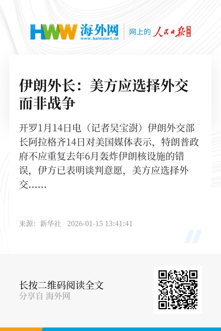 新华社开罗1月14日电(记者吴宝澍)伊朗外交部长阿拉格齐14日对美国媒体表示,特朗普政府不应重复去年6月轰炸伊朗核设施的错误,伊方已表明谈判意愿,美方应选择外交而非战争。