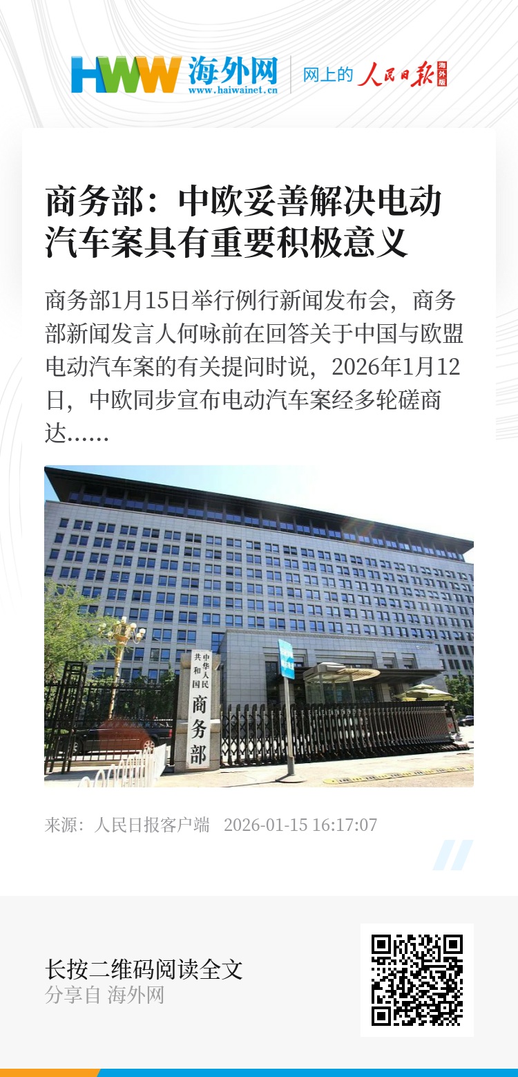 商务部1月15日举行例行新闻发布会,商务部新闻发言人何咏前在回答关于中国与欧盟电动汽车案的有关提问时说,2026年1月12日,中欧同步宣布电动汽车案经多轮磋商达成积极成果,受到国内外各界高度关注。中欧业界对此“高度欢迎并完全赞同”,认为电动汽车案“软着陆”将显著提振市场信心,为中欧汽车贸易投资合作注入新的动力。有欧盟政治家评价,这是朝着建立可持续中欧贸易关系迈出的积极一步,表明通过伙伴关系解决贸易分歧仍具可行性。