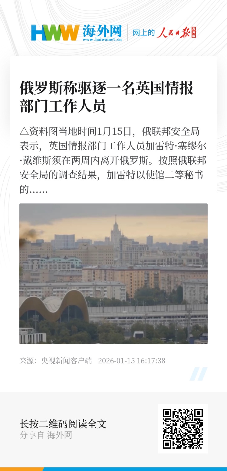 当地时间1月15日,俄联邦安全局表示,英国情报部门工作人员加雷特·塞缪尔·戴维斯须在两周内离开俄罗斯。
