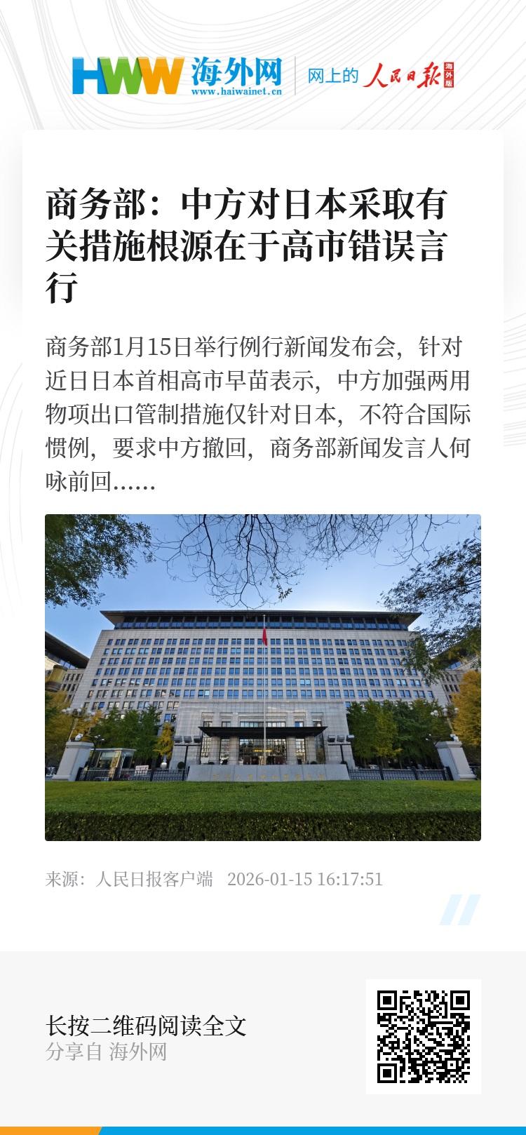 商务部1月15日举行例行新闻发布会,针对近日日本首相高市早苗表示,中方加强两用物项出口管制措施仅针对日本,不符合国际惯例,要求中方撤回,商务部新闻发言人何咏前回应称,中方对日本采取有关措施,根源在于高市首相的错误言行,日方心知肚明。