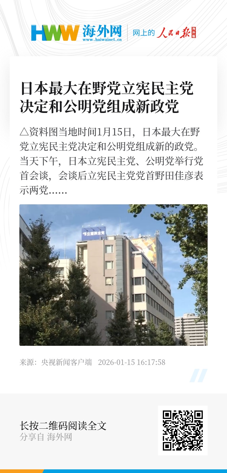 当地时间1月15日,日本最大在野党立宪民主党决定和公明党组成新的政党。