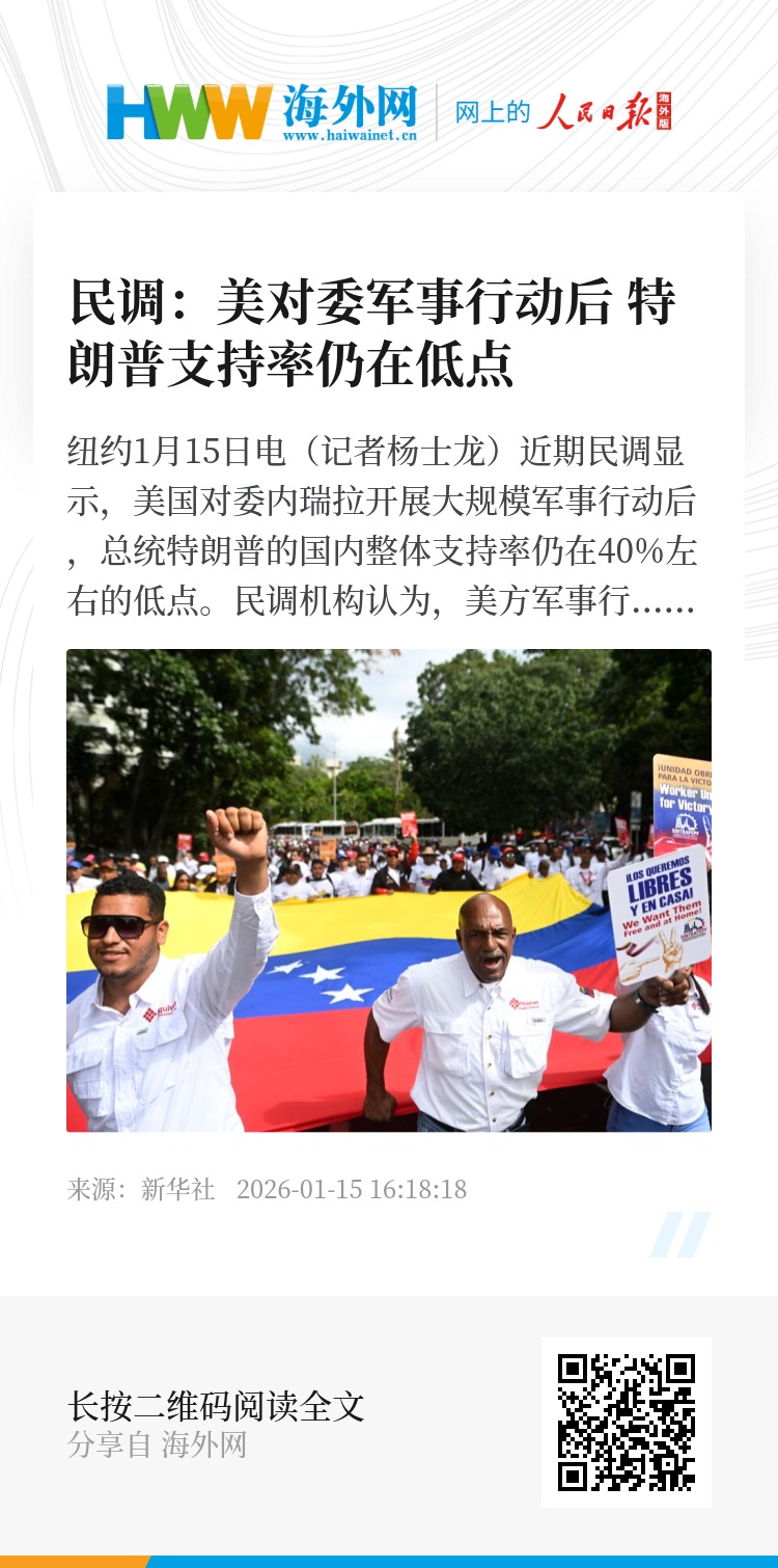 新华社纽约1月15日电(记者杨士龙)近期民调显示,美国对委内瑞拉开展大规模军事行动后 ,总统特朗普的国内整体支持率仍在40%左右的低点。民调机构认为,美方军事行动“充其量”是面向共和党人一次“团结行动”,不足以改变美国公众对现任总统根深蒂固的看法。