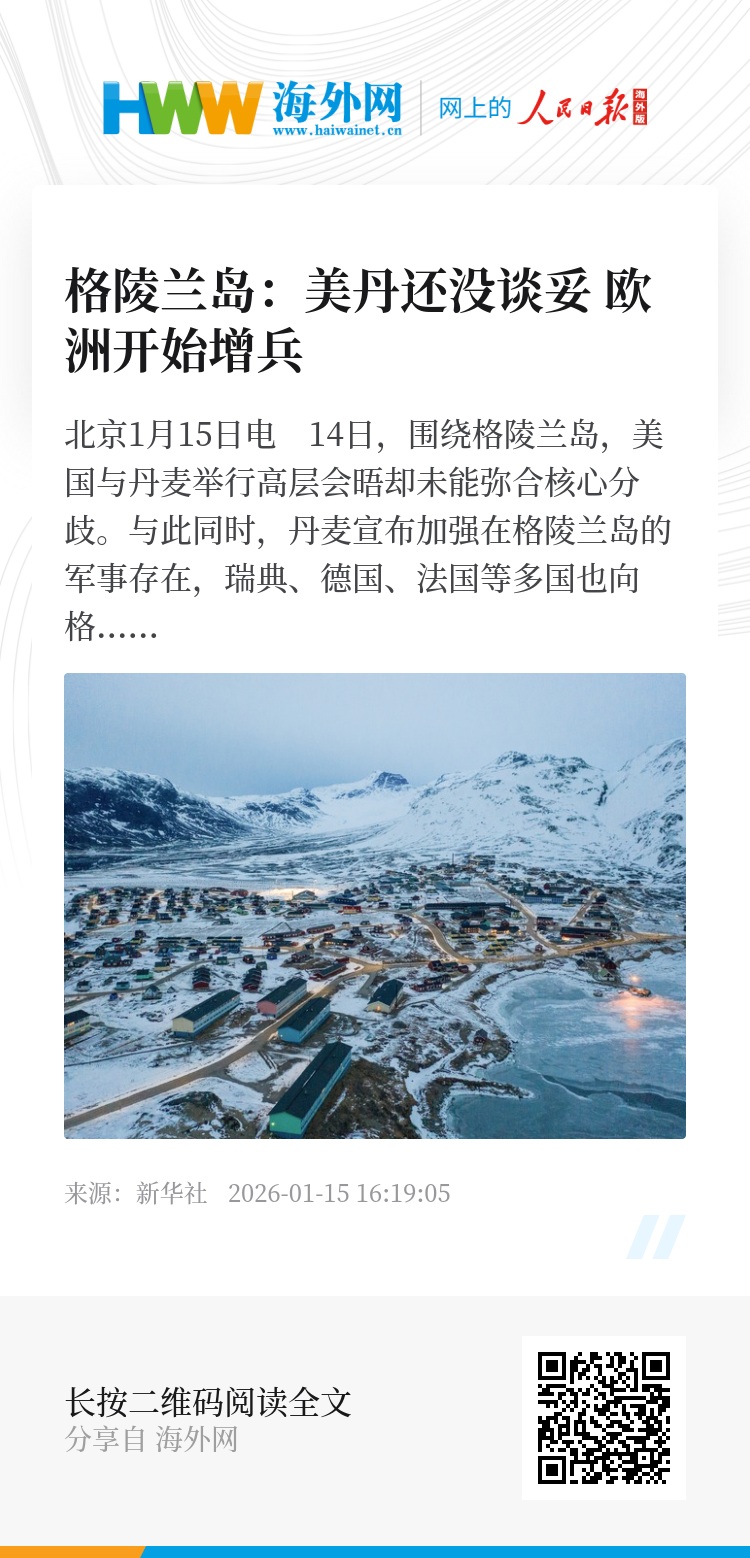新华社北京1月15日电 14日,围绕格陵兰岛,美国与丹麦举行高层会晤却未能弥合核心分歧。与此同时,丹麦宣布加强在格陵兰岛的军事存在,瑞典、德国、法国等多国也向格陵兰岛派遣军事力量或参与联合军事行动,格陵兰岛周边地缘政治局势持续升温。