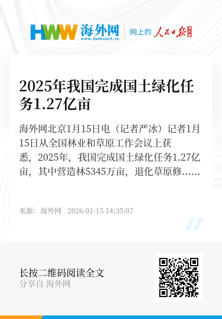 海外网北京1月15日电(记者严冰)记者1月15日从全国林业和草原工作会议上获悉,2025年,我国完成国土绿化任务1.27亿亩,其中营造林5345万亩,退化草原修复治理7390万亩。目前全国森林覆盖率达25.09%,森林蓄积量达209.88亿立方米,绿色发展底色成色更加鲜明。
