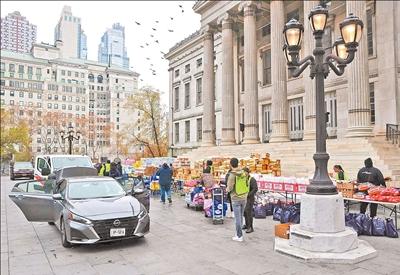 美国密歇根大学近日发布的调查显示,美国消费者信心指数持续下降,高物价和收入下滑令消费者感到沮丧。图为在美国纽约拍摄的一处免费食物发放点。