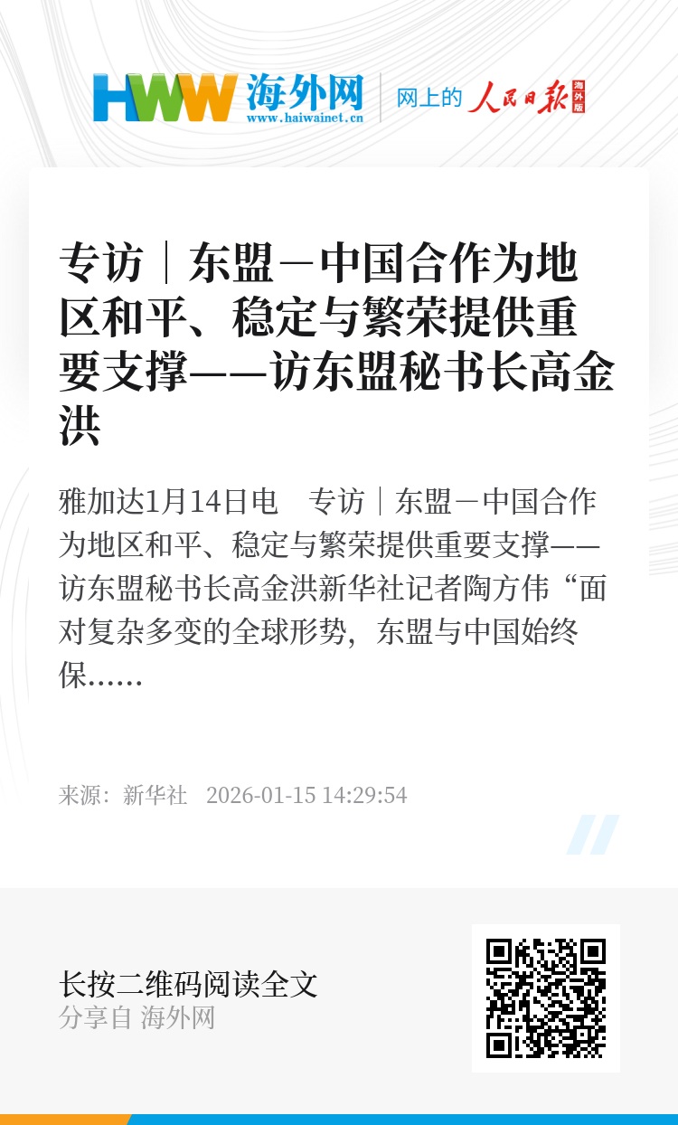 新华社雅加达1月14日电 专访|东盟-中国合作为地区和平、稳定与繁荣提供重要支撑——访东盟秘书长高金洪
