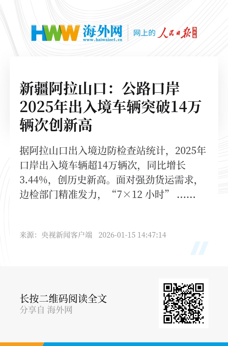 据阿拉山口出入境边防检查站统计,2025年口岸出入境车辆超14万辆次,同比增长3.44%,创历史新高。