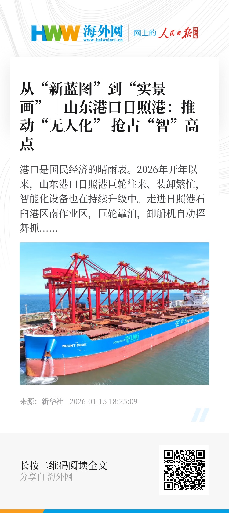 港口是国民经济的晴雨表。2026年开年以来,山东港口日照港巨轮往来、装卸繁忙,智能化设备也在持续升级中。