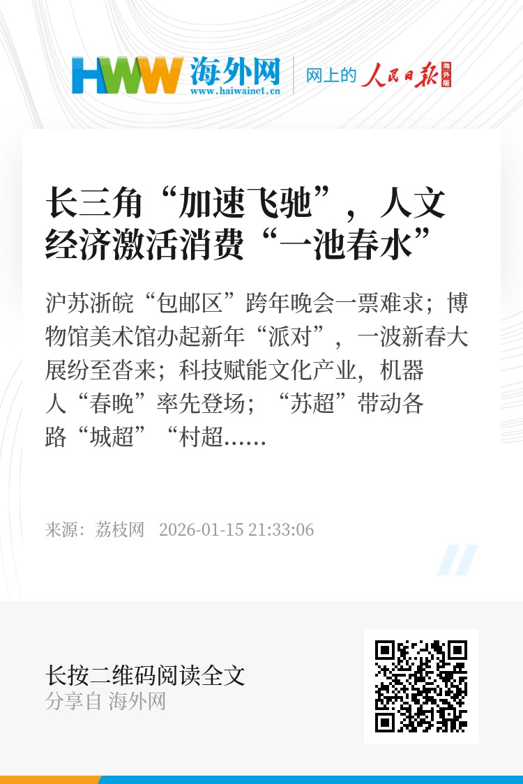 沪苏浙皖“包邮区”跨年晚会一票难求;博物馆美术馆办起新年“派对”,一波新春大展纷至沓来;科技赋能文化产业,机器人“春晚”率先登场;“苏超”带动各路“城超”“村超”……岁末年初,从长江入海口到安徽皖江畔,以文化赋能经济社会发展,长三角文体融合、商旅联动在奔跑中“加速飞驰”。放眼当下,长三角这片人文经济沃土正迸发更强生机,不仅勾勒出了未来美好生活的全新坐标,也在持续激活消费“一池春水”。