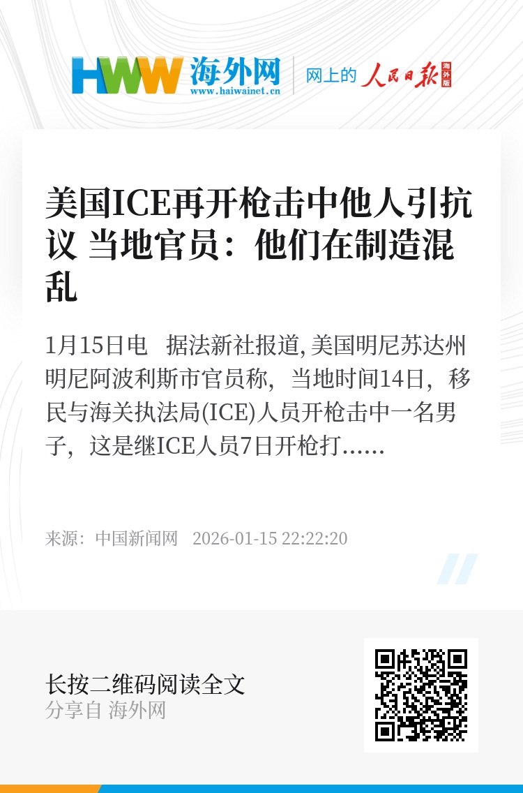 中新网1月15日电 据法新社报道,美国明尼苏达州明尼阿波利斯市官员称,当地时间14日,移民与海关执法局(ICE)人员开枪击中一名男子,这是继ICE人员7日开枪打死一名美国籍女子后,再一次在明尼阿波利斯市开枪击中他人。