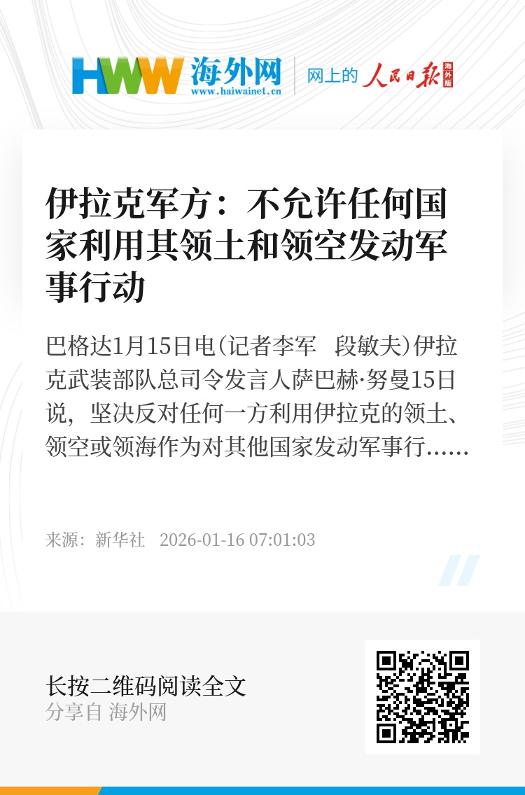 新华社巴格达1月15日电(记者李军 段敏夫)伊拉克武装部队总司令发言人萨巴赫·努曼15日说,坚决反对任何一方利用伊拉克的领土、领空或领海作为对其他国家发动军事行动的平台,并呼吁有关各方保持克制,通过对话和外交途径解决分歧。