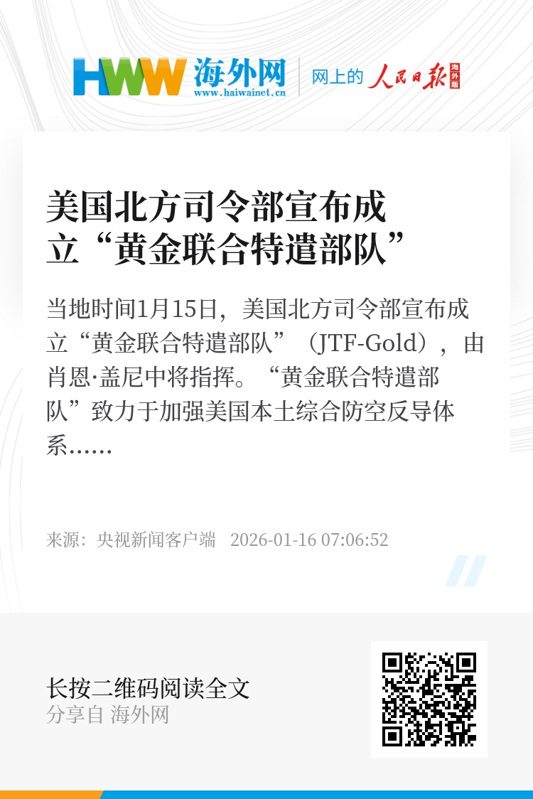 当地时间1月15日,美国北方司令部宣布成立“黄金联合特遣部队”(JTF-Gold),由肖恩·盖尼中将指挥。