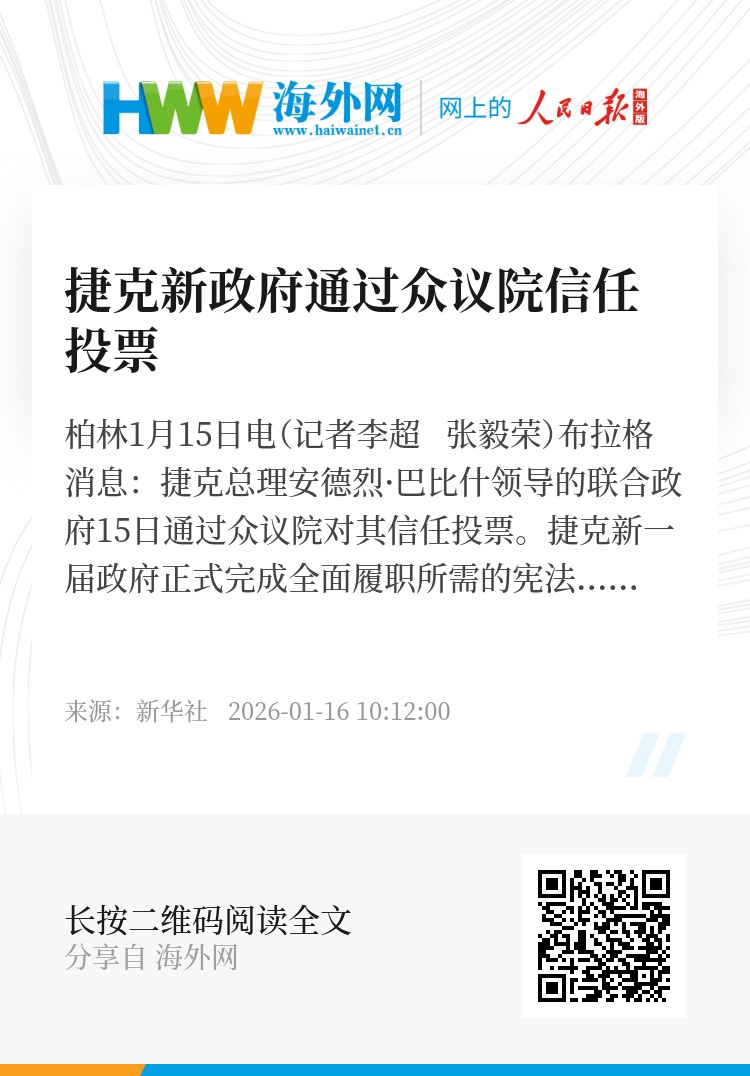 新华社柏林1月15日电(记者李超 张毅荣)布拉格消息:捷克总理安德烈·巴比什领导的联合政府15日通过众议院对其信任投票。捷克新一届政府正式完成全面履职所需的宪法程序。