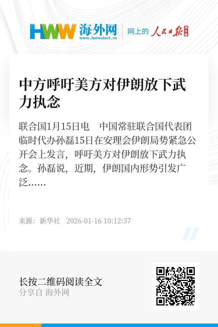 新华社联合国1月15日电 中国常驻联合国代表团临时代办孙磊15日在安理会伊朗局势紧急公开会上发言,呼吁美方对伊朗放下武力执念。