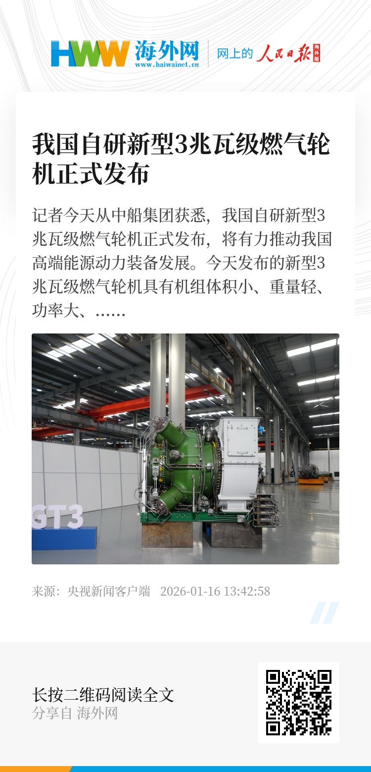 记者今天从中船集团获悉,我国自研新型3兆瓦级燃气轮机正式发布,将有力推动我国高端能源动力装备发展。