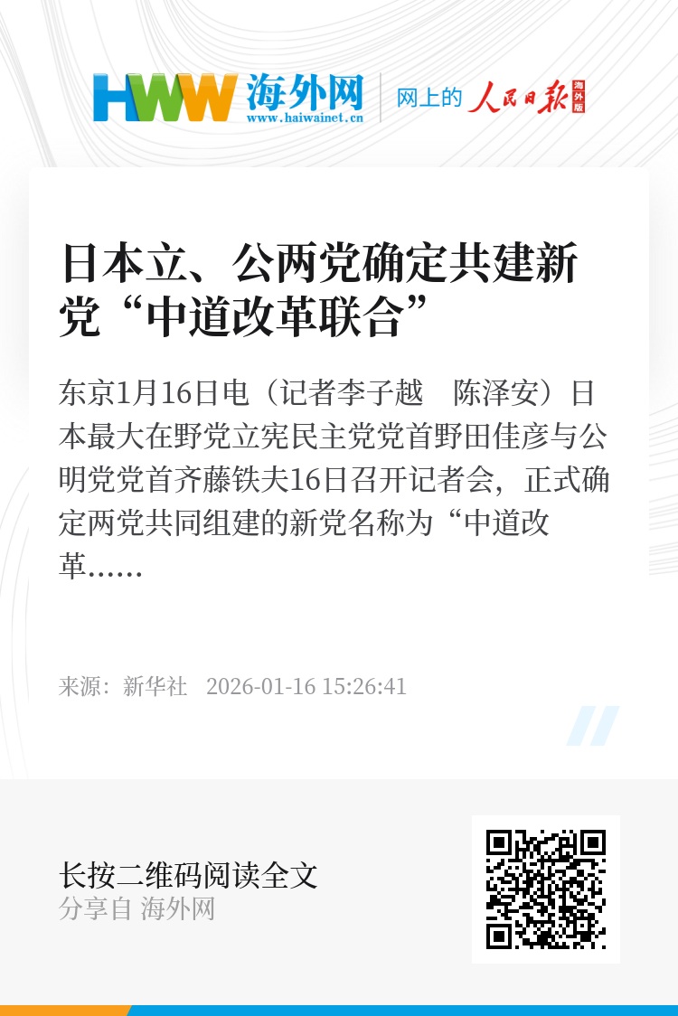 公明党去年10月退出执政联盟后,一直呼吁集结日本政坛中间派势力,对抗高市阵营;立宪民主党方面也一直有与公明党加强合作的意愿。随着日本首相高市早苗确定将于23日开幕的国会初始阶段解散众议院、提前进行大选,新党成立的时机进一步成熟。