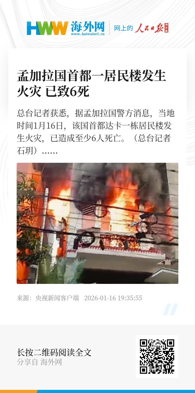总台记者获悉,据孟加拉国警方消息,当地时间1月16日,该国首都达卡一栋居民楼发生火灾,已造成至少6人死亡。(总台记者 石玥)