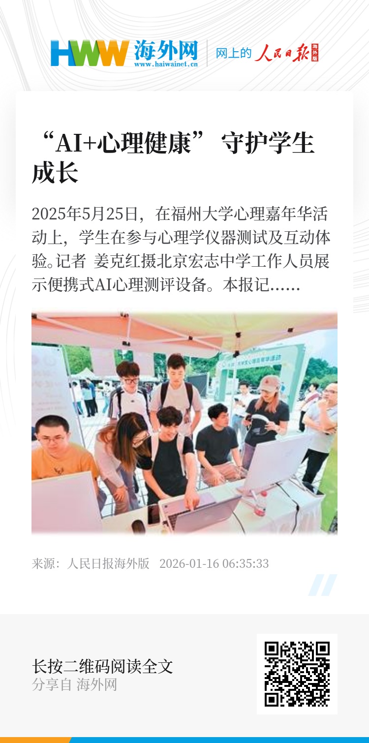 “中小学是青少年心理健康发展的关键时期。对学校来说,加强学生心理健康教育、完善心理危机筛查机制是一项十分重要的工作。”北京邮电大学电子工程学院教授俞俊生认为,“AI技术能辅助进行学生心理问题识别,提示青少年心理健康风险,达到‘早发现、早干预’的效果。”