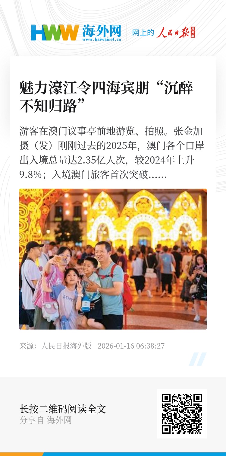 得益于中央一系列惠澳政策和特区政府有力施政,澳门旅游业正实现由复苏性增长向高质量发展的转型。2026年是“十五五”规划开局之年,澳门特区政府明确要主动对接国家规划建议,立足世界旅游休闲中心建设,结合澳门所长、湾区优势,扩大更高质量的旅游产品和服务供给,提升澳门文旅品质内涵与综合竞争力,以实现百尺竿头、更进一步。(本报记者 富子梅 任成琦)