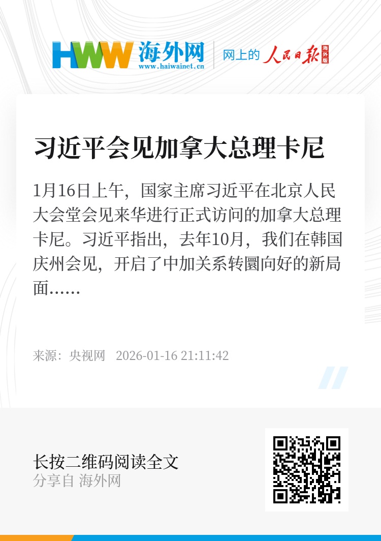 1月16日上午,国家主席习近平在北京人民大会堂会见来华进行正式访问的加拿大总理卡尼。