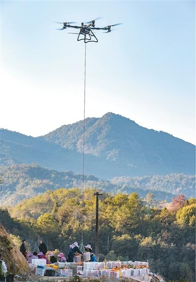 正值广东平远脐橙丰收季,当地通过科技手段助力果农脐橙运输,为丰收年助力赋能。图为近日,在广东省梅州市平远县奇士果业有限公司脐橙基地黄坑果场,无人机正在吊运刚刚采摘的平远脐橙。
